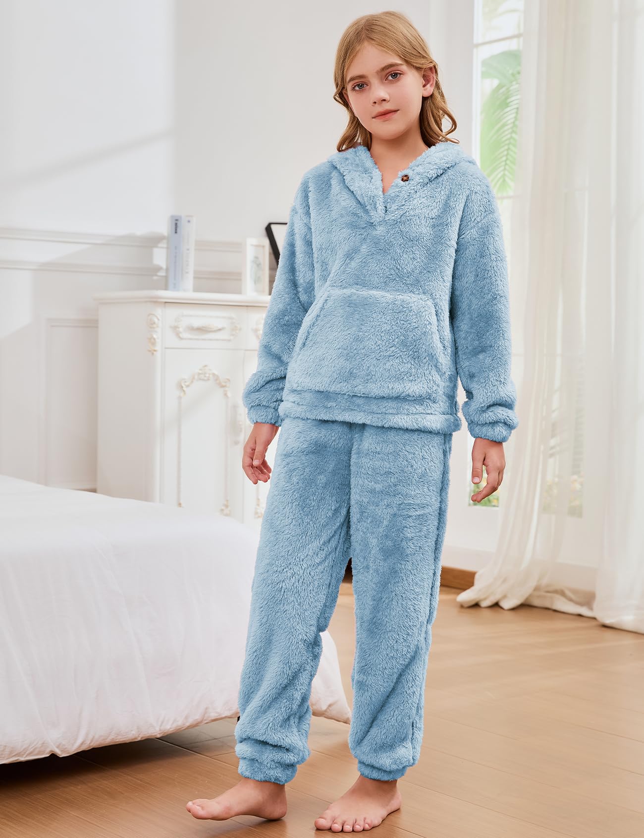 - Fuzzy Girls Sweatsuit: This fuzzy pants sets are covered with soft, thick fleece from the hood to the ankles, providing all-around coverage. The comfortable and cozy fabric is skin-friendly and non-irritating, and the fuzzy fleece keeps your child warm during morning routines, after bath time, or while relaxing, giving your child a hug-like sense of security