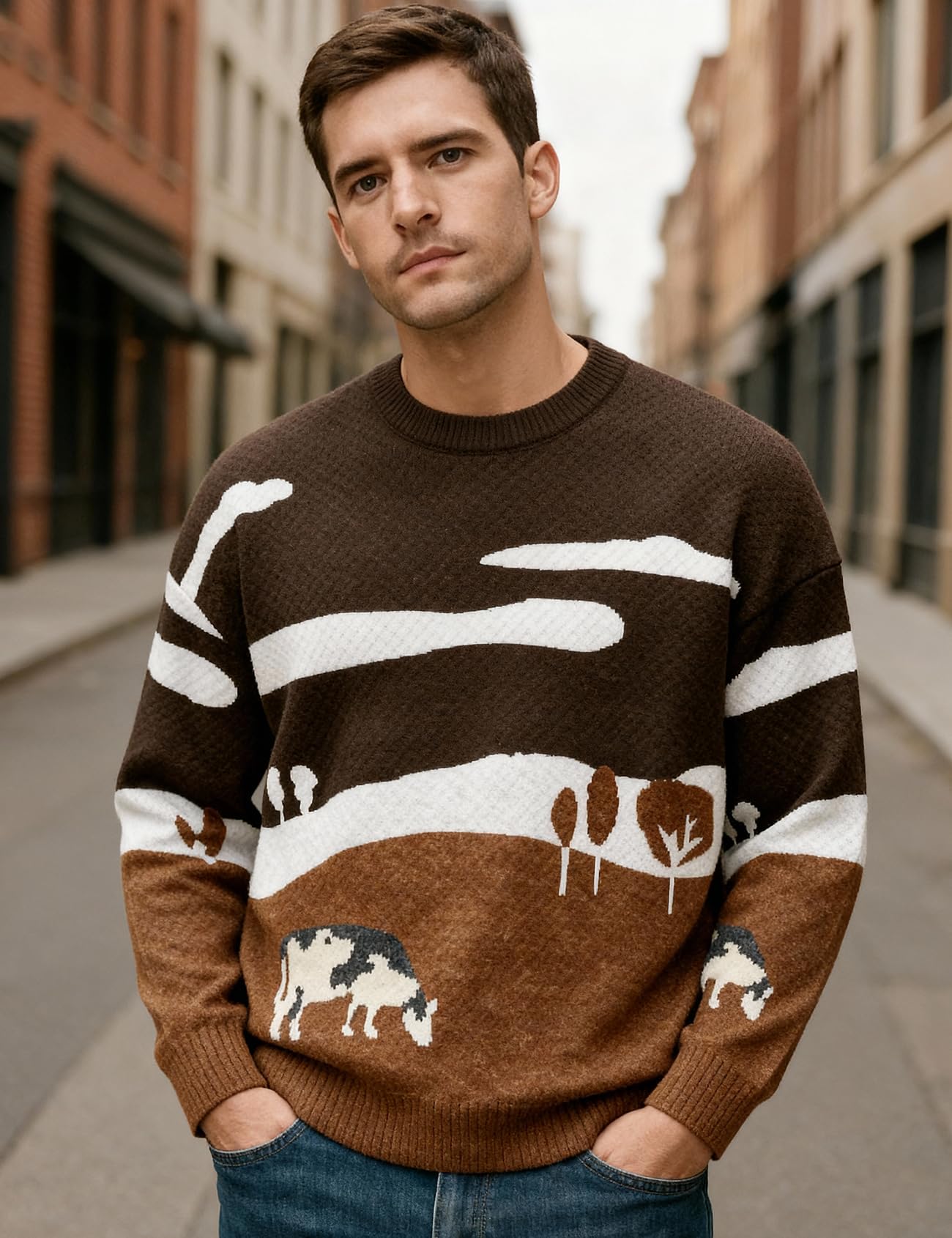 - ăMaterialăGraphic cow sweater made of soft, skin-friendly and cozy knitted material, warm and comfortable, vintage fashion men cow animals print graphic sweaters jumper top, perfect for fall, winter and spring