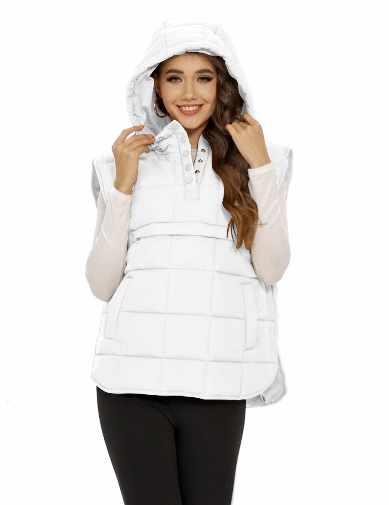- Unique Design: Hooded pullover puffer jackets womens, with funnel collar, sleeveless hoodie women, relaxed pullover fit with a hooded button-up neckline, 2 side pockets and front zipper big pocket for daily storage convenience
