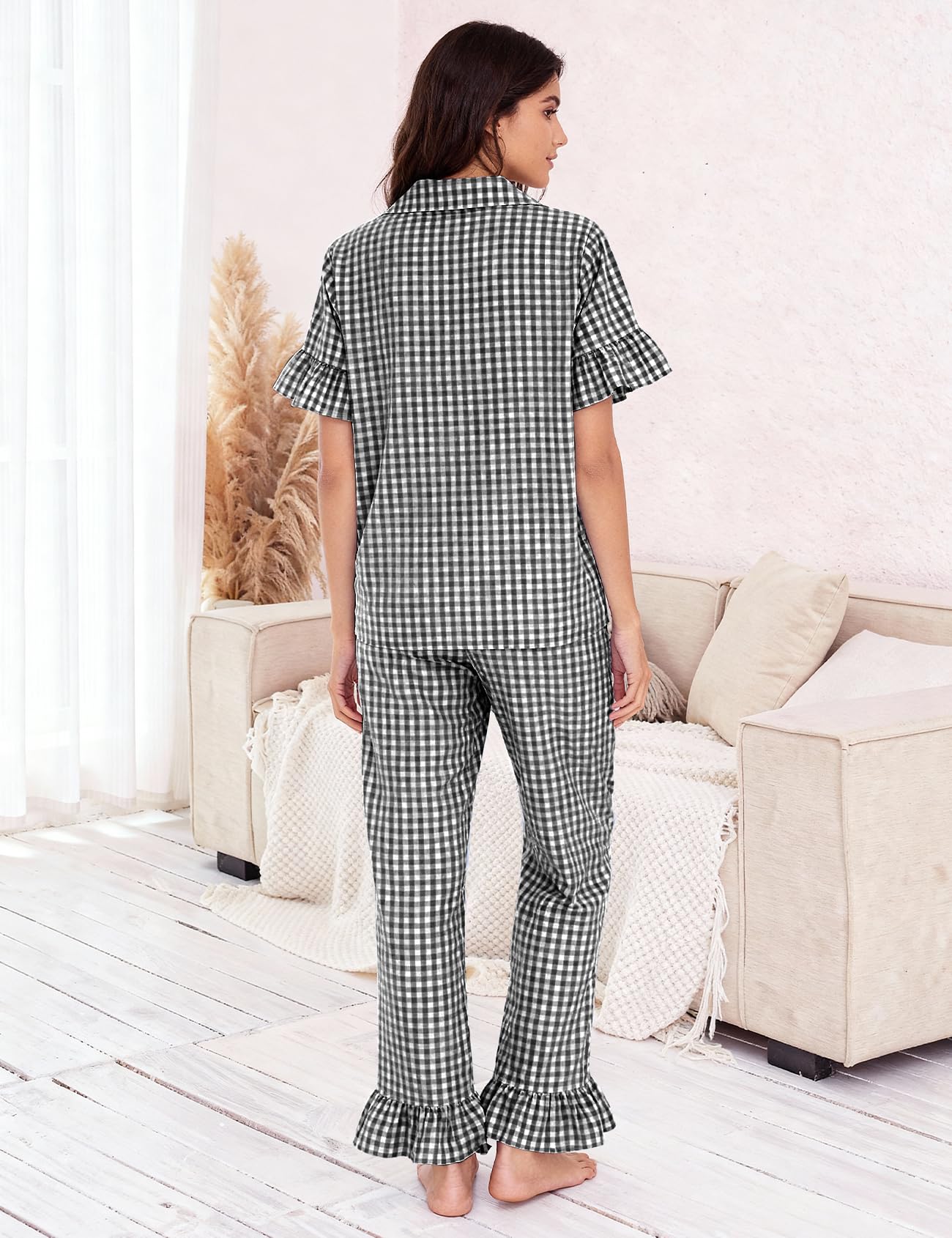 Flygo Womens Plaid Pajamas Sets 2 Piece Cotton Pj Set Ruffled Sleeve Button Down Shirt Gingham Pants Lounge Sets
